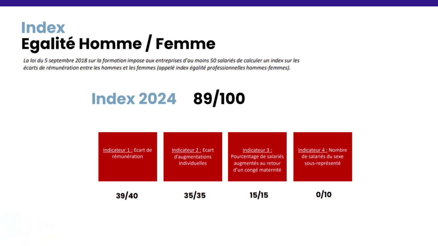 The professional equality index allows the company to measure salary equity between women and men. It highlights the points of progress on which the company must act when disparities are not justified.
