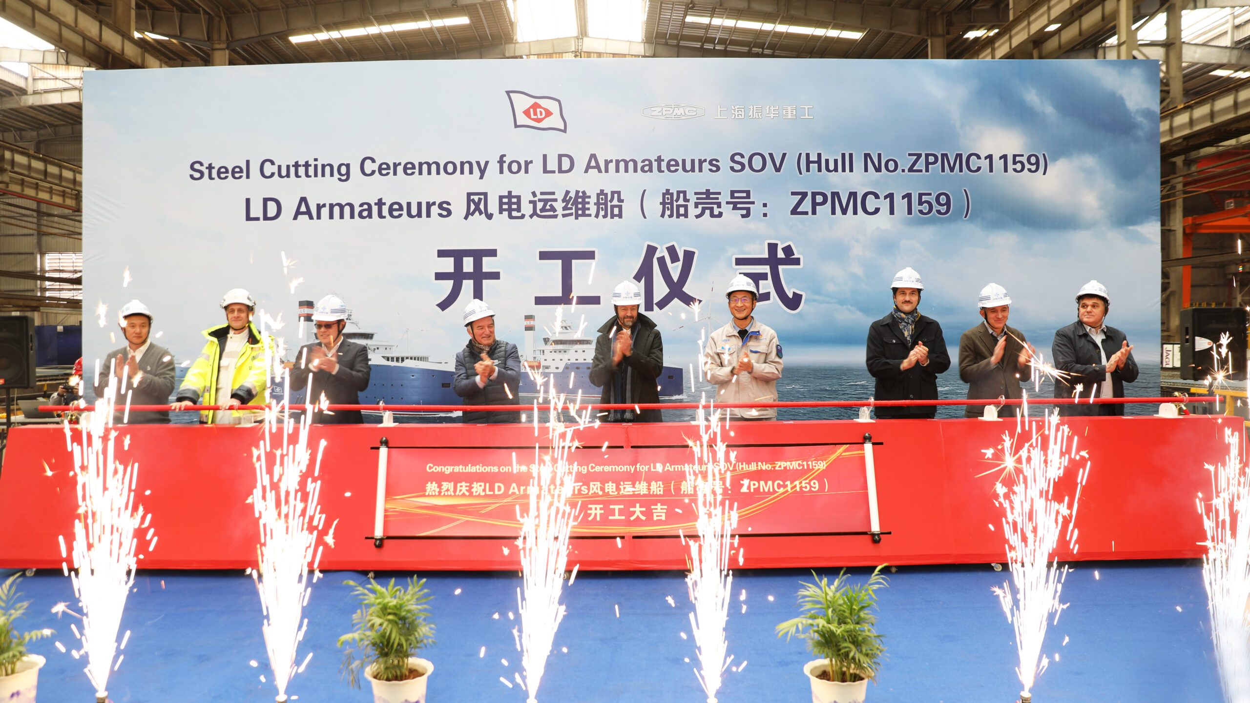 LD Armateurs is proud to announce that the steel cutting ceremony for the first of two Service Operation Vessels (SOVs) ordered by Vattenfall took place on November the 27th. This milestone marks the official start of construction at ZPMC (Shanghai Zhenhua Heavy Industries Company Limited), a shipyard globally recognized for its expertise in bespoke designs and steadily expanding into the offshore vessel sector.