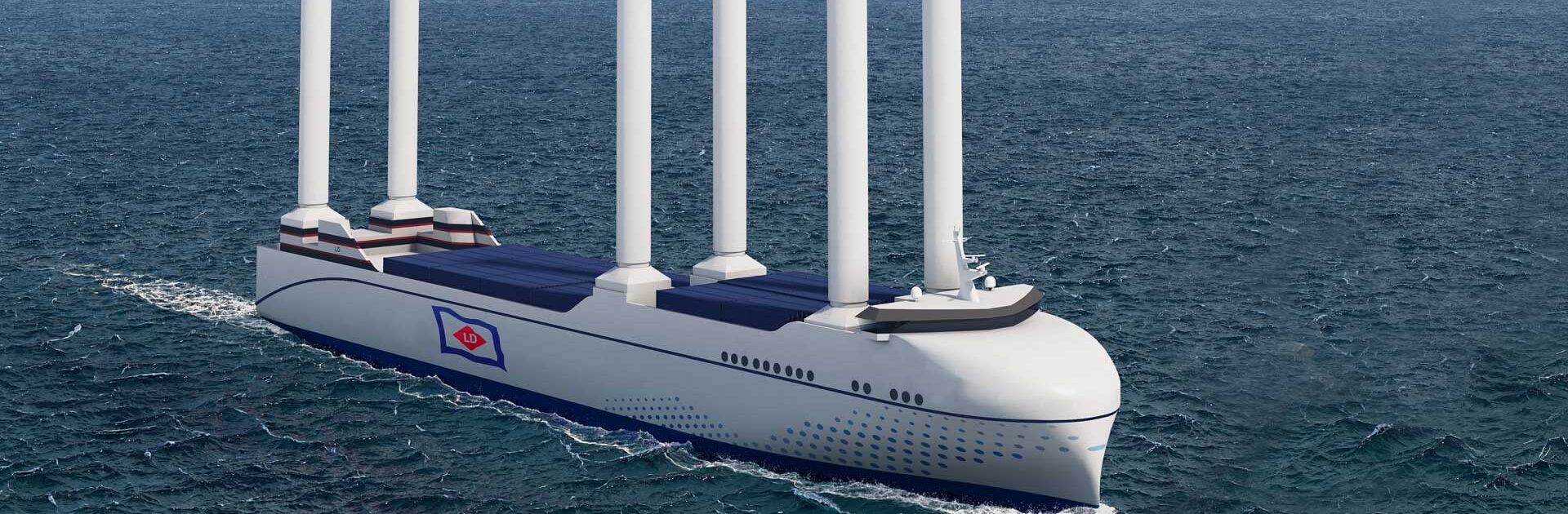 Propulsion vélique : 50 % de la propulsion assurée par des Flettner rotors permettant d’atteindre une vitesse moyenne de 14 nœuds.